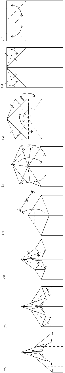 Vliegtuigje vouwen model 9Op deze site zul je allerlei soorten vliegtuigmodelen zien die je zelf kunt vouwen. In de loop der tijd zullen er steeds meer te vouwen vliegtuigjes te vinden zijn op deze site. Dus wacht niet langer met het vouwen van je vliegtuigje en neem een vlucht over deze site. Het is u gelukt om dit vliegtuigje te vouwen met behulp van www.vliegtuigjevouwen.nl ! |